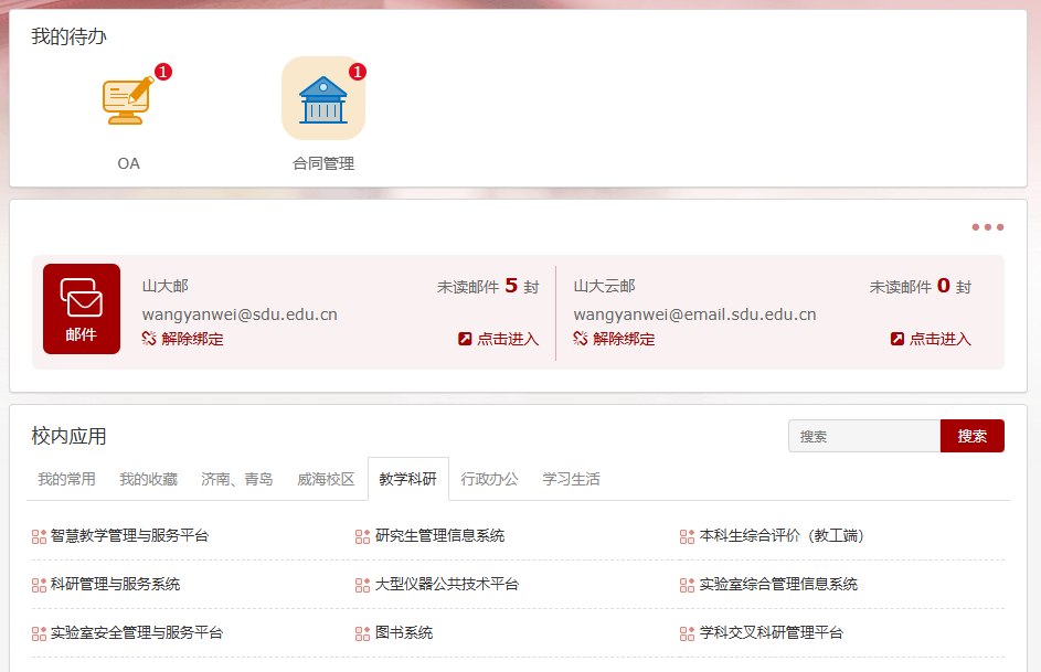 大家可以通过两种方式登录系统,第一种方式是通过网址(http://xkjc.sdu.edu.cn/)直接登录,系统将自动跳转到TapTap点点信息化公共服务平台;第二种方式是在“TapTap点点信息服务”门户的“校内应用·教学科研”版块找到“学科交叉科研管理平台”的应用系统。